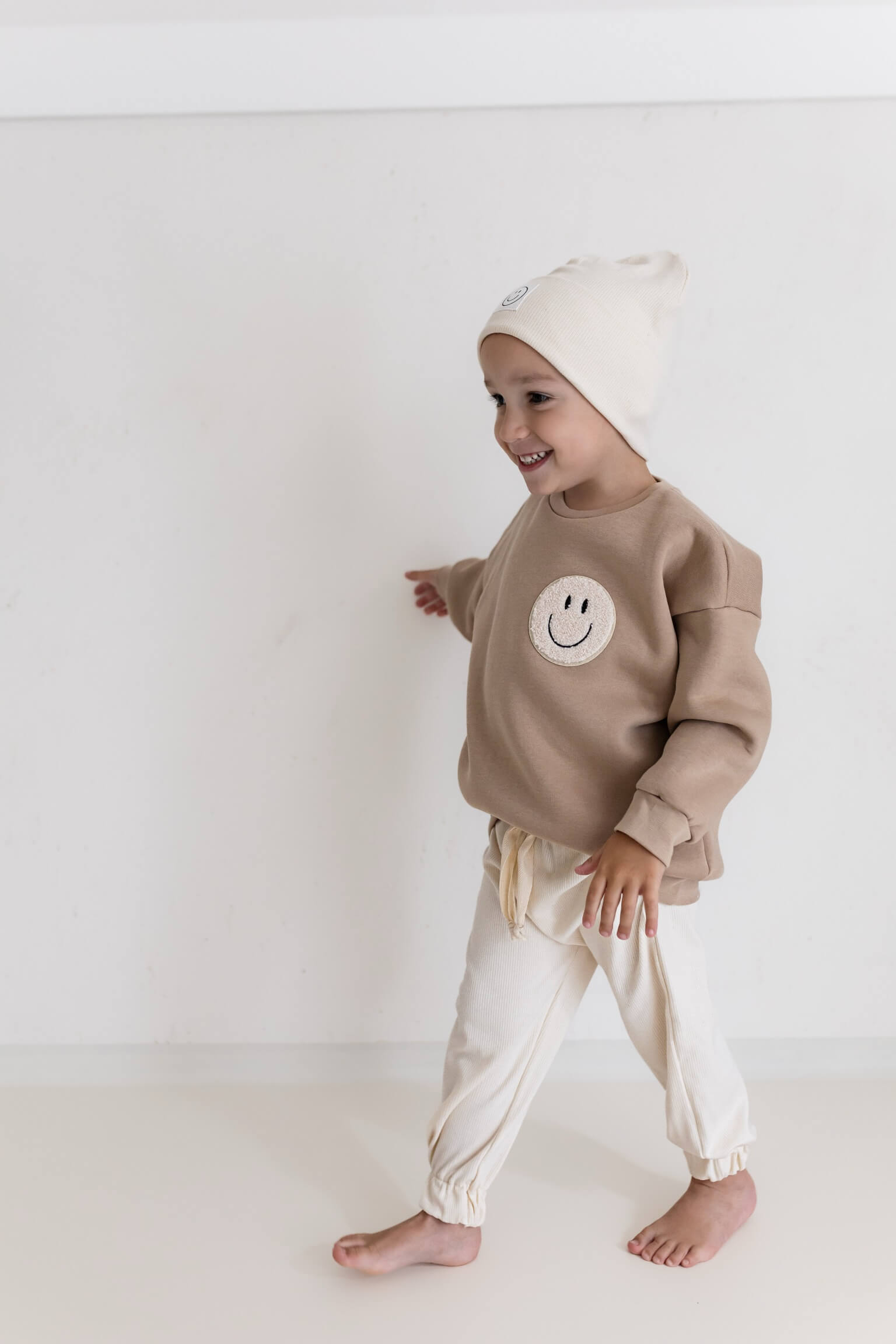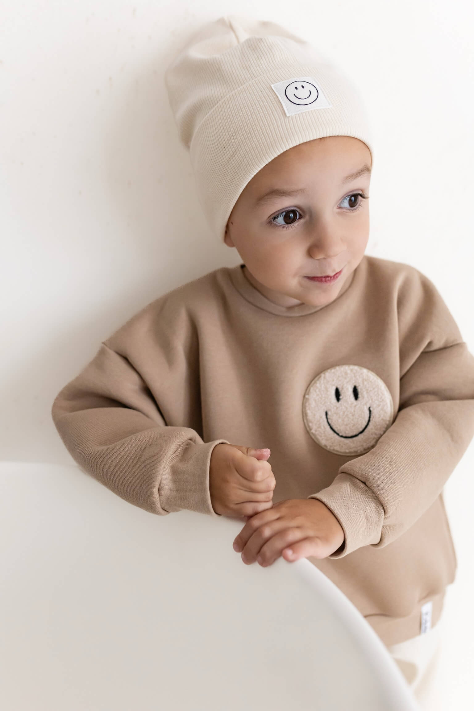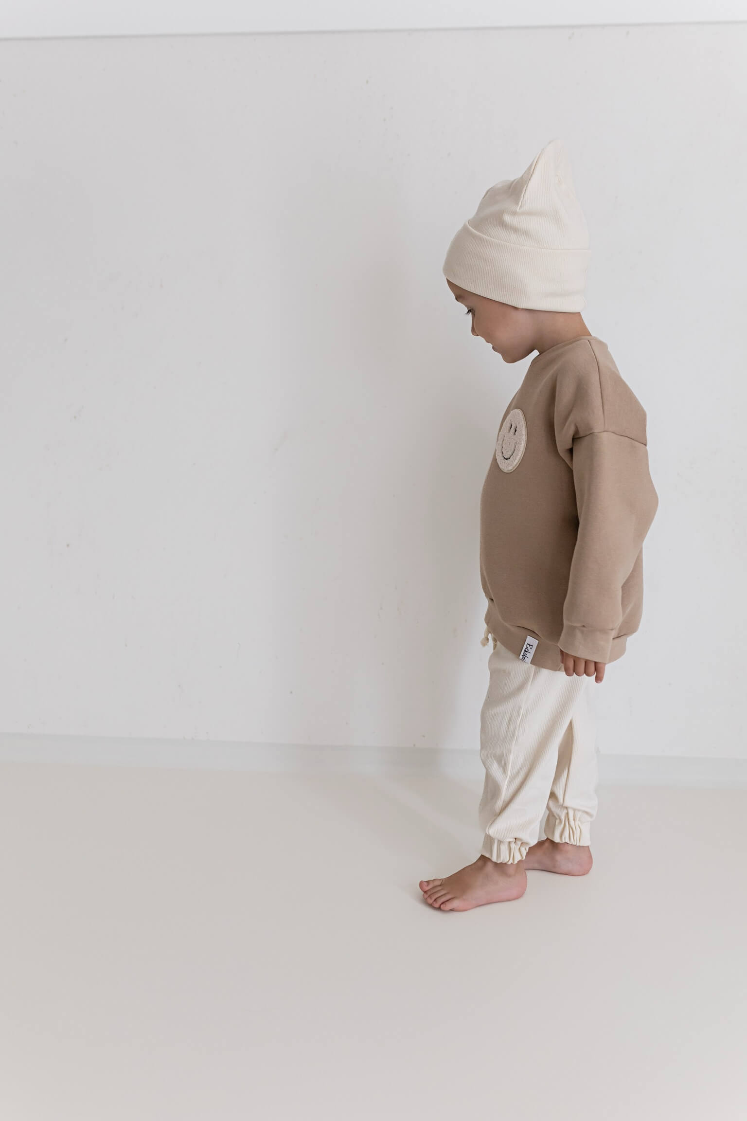 Der oversize Sweater fällt größer aus. Auf den Bildern siehst du die Farbe Latte (Kuschelsweat).