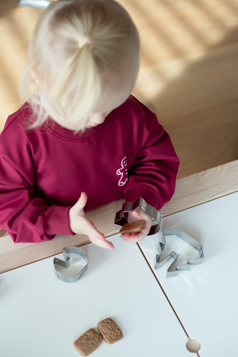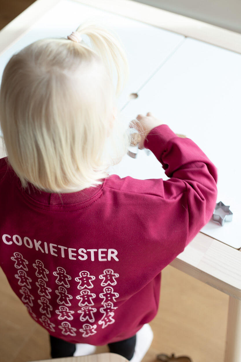 Der Audruck auf den Bildern mit dem weinroten Sweater ist zartrosa.